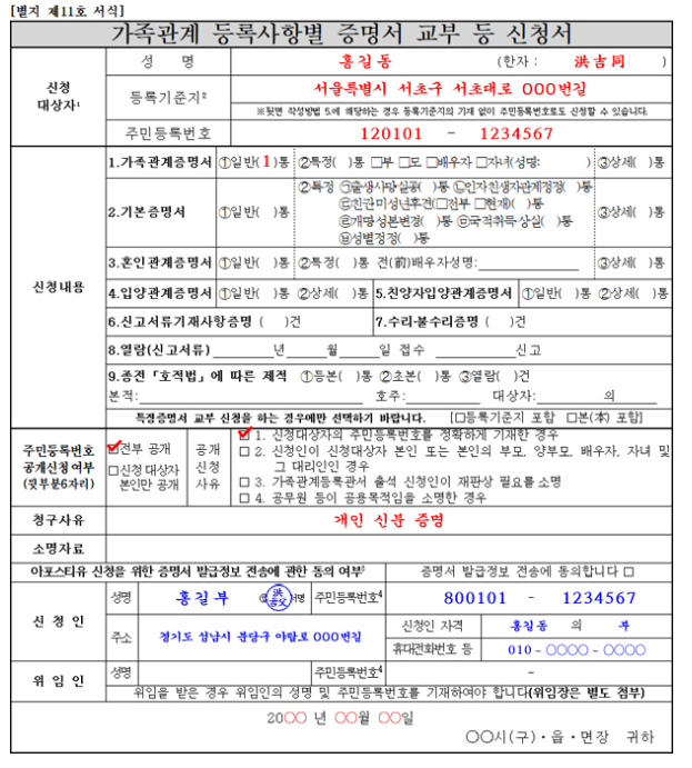 가족관계등록부에는 가족관계증명서, 기본증명서, 혼인관계증명서, 입양관계증명서, 친양자 관계증명서가 있는데 본인을 기준으로 등록기준지, 성명, 성별, 본, 출생연월일, 주민등록번호는 공통사항이며 주민등록번호를 전부 공개, 전부 비공개, 신청대상자 본인만 공개 중 선택 할 수 있습니다.