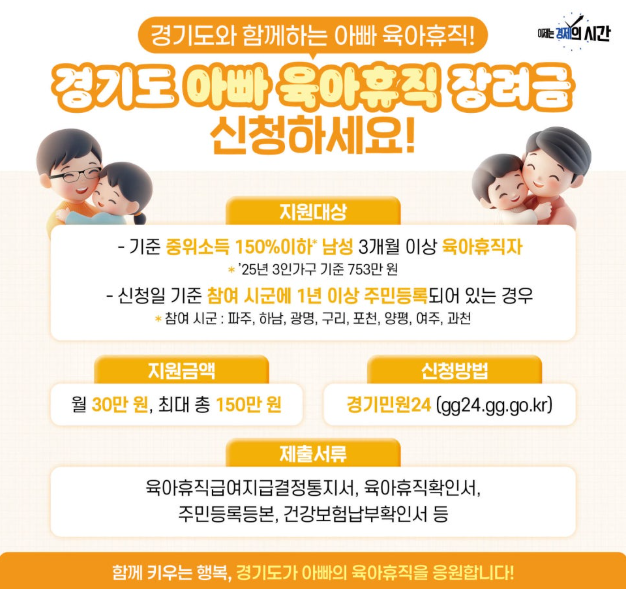 “아빠도 당당하게 육아할 수 있도록!” 경기도가 육아휴직하는 아빠에게 월 30만원씩 최대 5개월간 지원합니다. 가족의 균형 있는 삶, 지금 바로 시작해보세요!