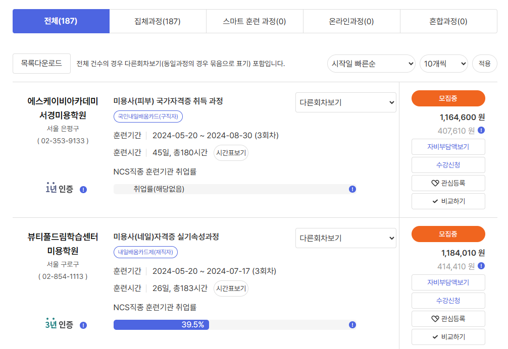 지역, NCS직종, 훈련유형, 개강일자 조회 하셔서 수강 신청 해주시면 됩니다.