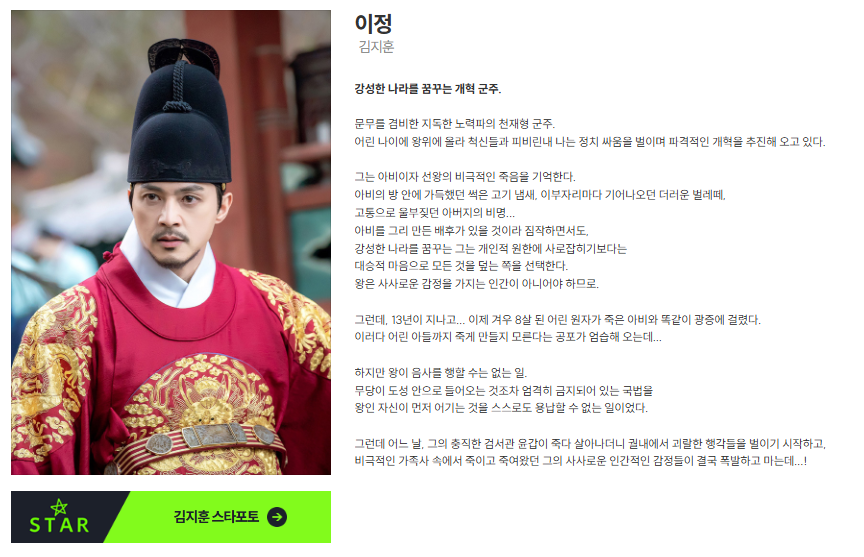 | 이정 | 김지훈 | 비극적 운명을 지닌 왕 |