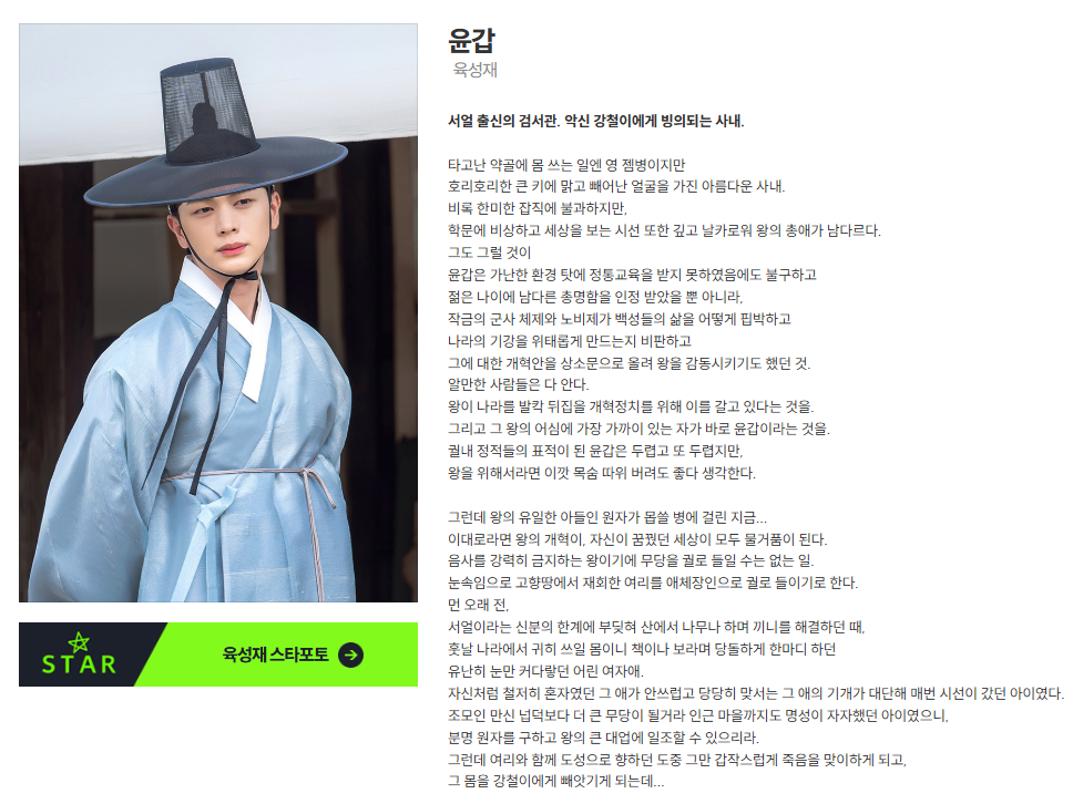 윤갑(육성재) – 원래는 검서관으로 궁에 들어갈 계획이었으나 불의의 사고로 죽고, 이무기 강철이가 그의 몸을 빙의함