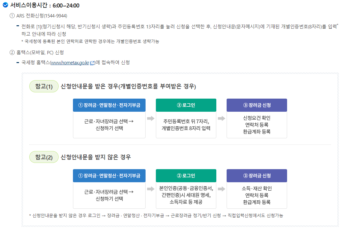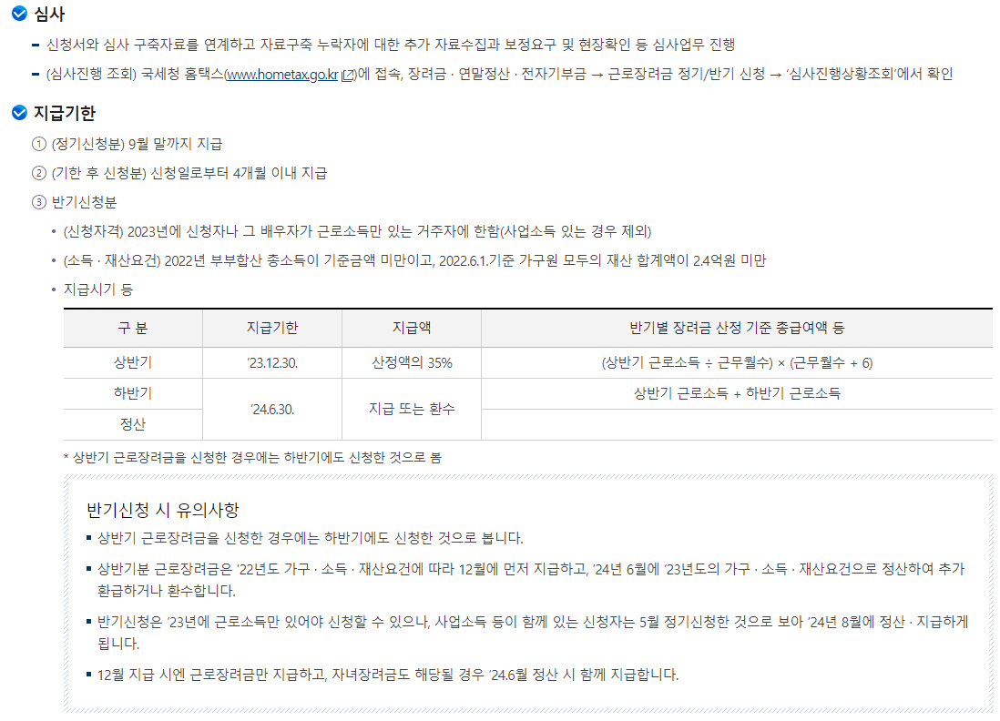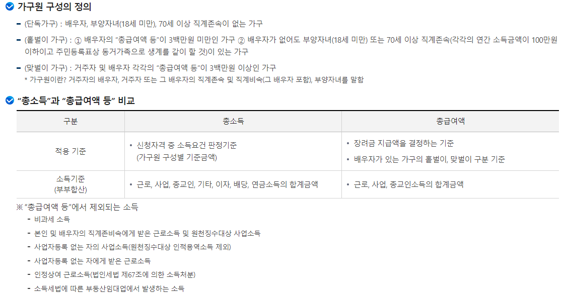 일은 하지만 소득이 적어 생활이 어려운 근로자, 사업자(전문직 제외)가구에 대하여 가구원 구성과 근로소득, 사업소득 또는 종교인소득에 따라 산정된 근로장려금을 지급함으로써 근로를 장려하고 실질소득을 지원하는 근로연계형 소득지원 제도입니다. 근로장려금은 가구원 구성에 따라 정한 부부합산 총급여액 등을 기준으로 지급액을 산정합니다.