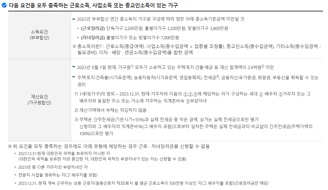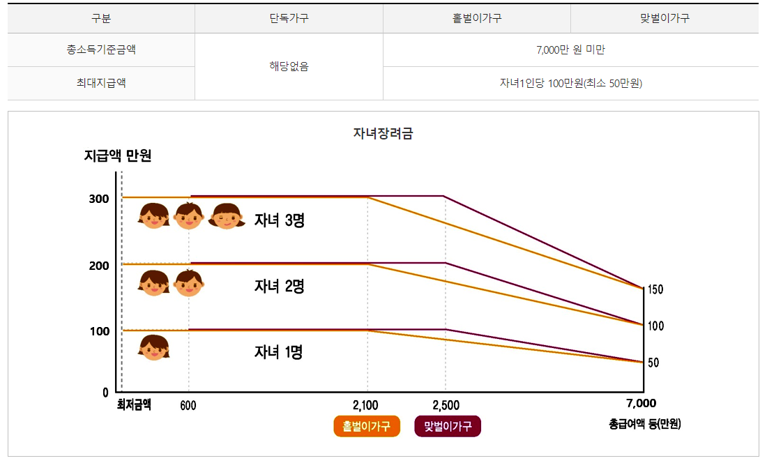 저소득 가구의 자녀양육을 지원하기 위해 총소득(부부합산) 7,000만원 미만이면서 부양자녀(18세 미만)가 있는 경우 1인당 최대 100만원(최소50만 원)을 지급하는 제도로 총소득 기준을 제외한 나머지 수급요건은 근로장려금과 동일합니다.