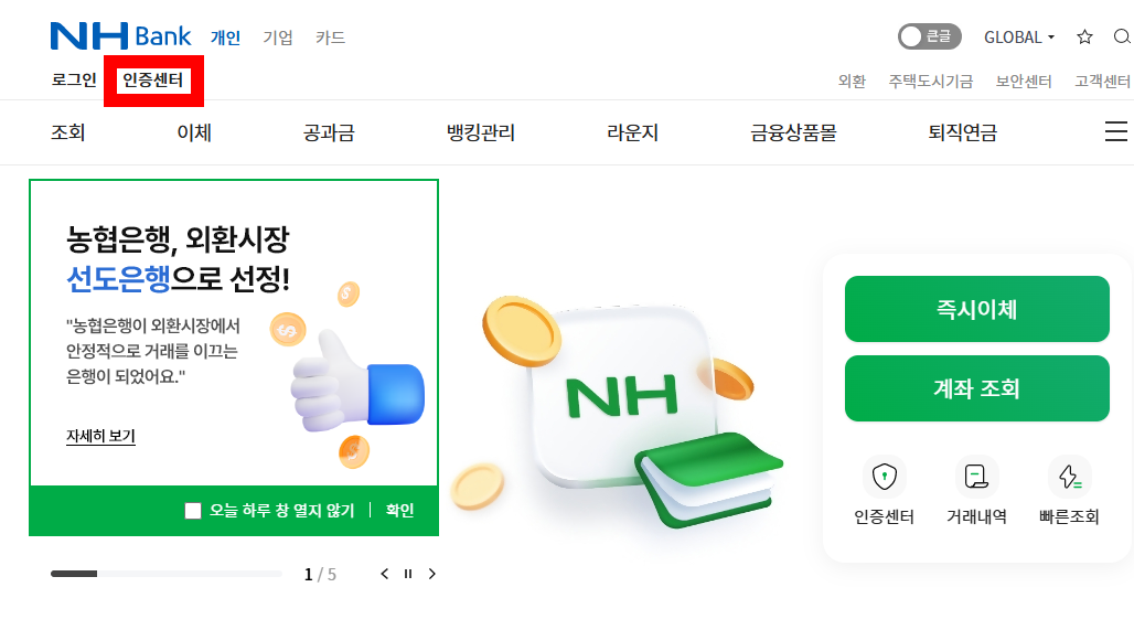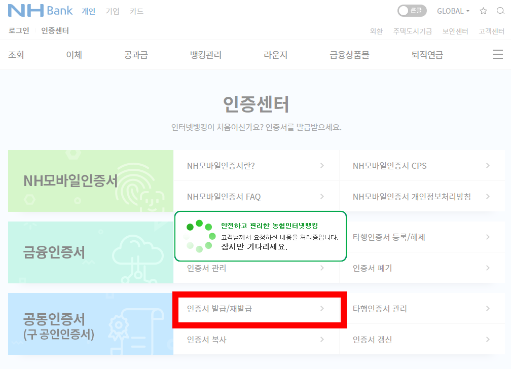 - 농협 인터넷뱅킹 로그인 후 공인인증센터 이동