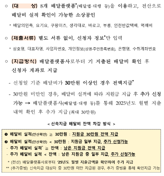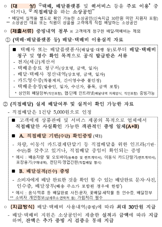 신청 당시 배달비가 30만 원 이상이면 바로 전액 지원 , 30만 원 미만이어도 이후 실적 제출 시 추가 신청 가능