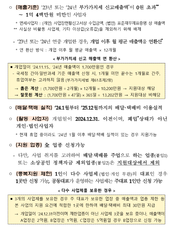 지원 대상은 연 매출 1억 4백만 원 이하의 소상공인입니다. 2024년 1월부터 2025년 12월까지의 배달 또는 택배 실적이 있는 개인사업자 또는 법인이라면 누구나 가능해요. 배달앱·대행·직접배송 등 실적 유형에 따라 ‘신속지급’과 ‘확인지급’으로 나뉘며, 최대 30만원까지 지원받을 수 있어요.