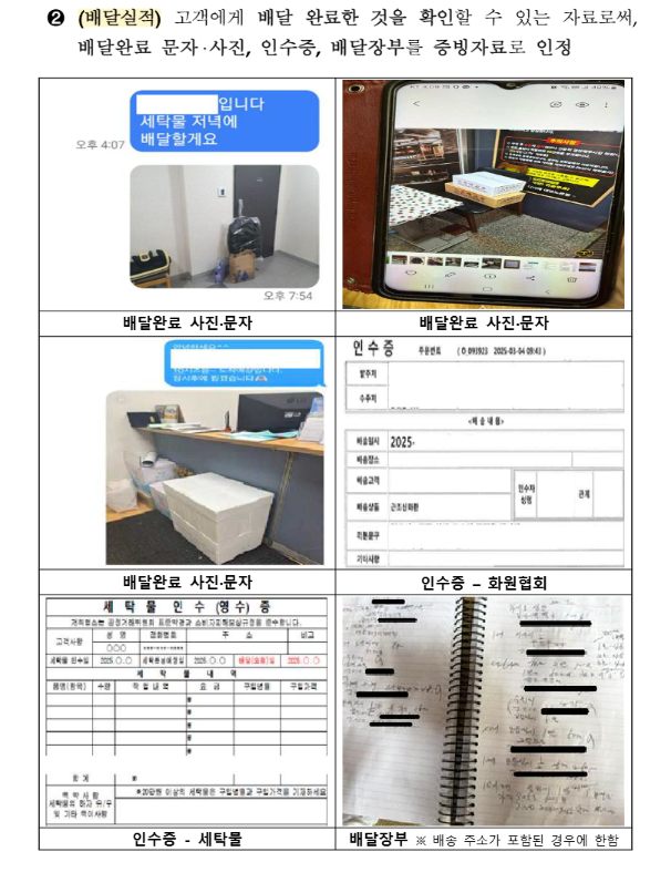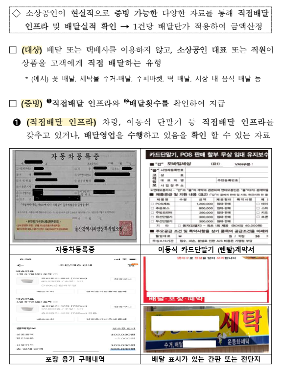 - 직접 배달의 경우 차량등록증, 이동식 단말기 계약서, 포장용기 구매내역, 배달완료 문자·사진, 인수증 등