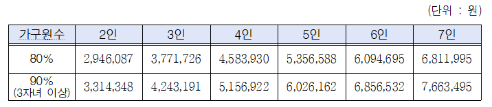 ▶ 단, 3자녀 이상 가구의 경우 기준중위소득 90% 이하(가구당 1명의 자녀만 신청 가능)