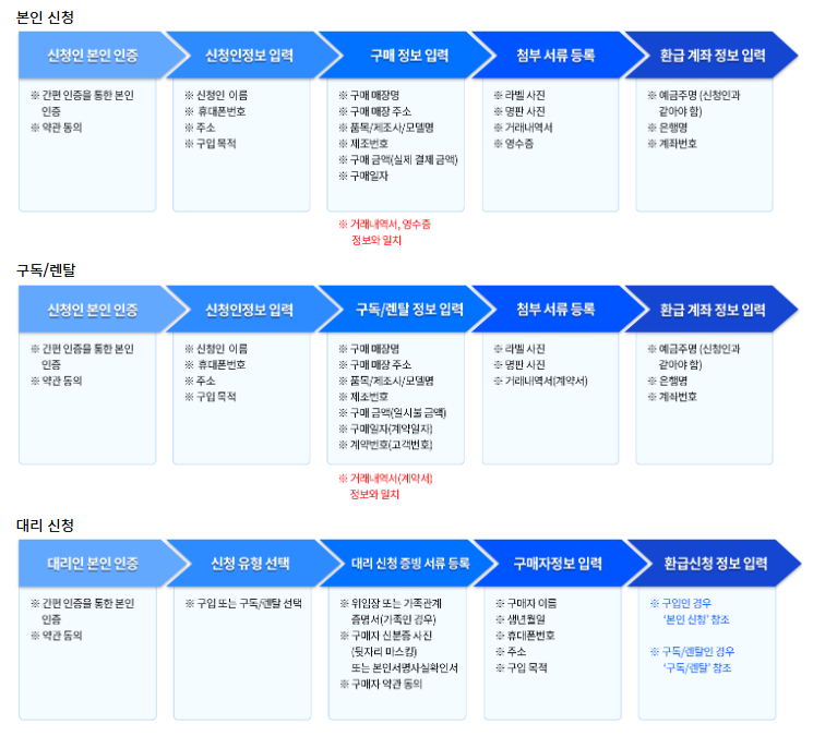 대리 신청 시, 구입 또는 구독/렌탈 여부에 따라 필요한 서류가 다르니 반드시 확인하시기 바랍니다.