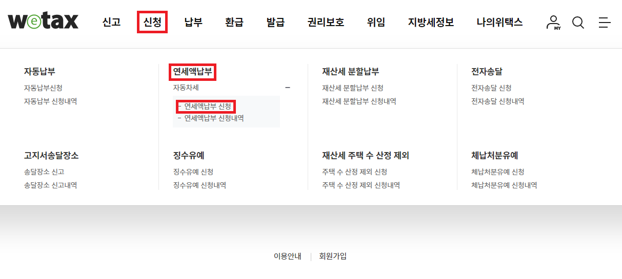 ② 신청하기 → 자동차세 → 연세액납부신청 순으로 클릭하여 개인정보를 입력하신후 신청을 진행하시면 됩니다.