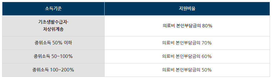 ☞ 본인부담 의료비 중 지원제외 항목을 차감한 금액에서 소득구간에 따라 50~80%지원됩니다.