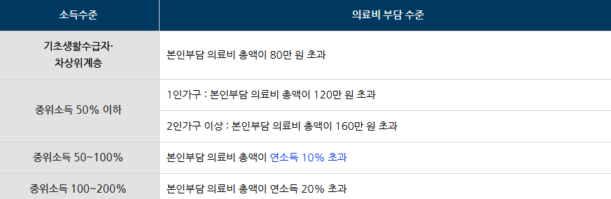 ☞ 기준중위소득 100%초과 ~ 200%이하 대상자는 본인부담의료비 20%초과자로 개별심사 합니다.