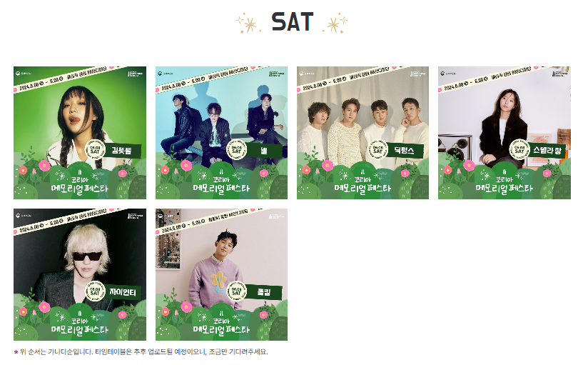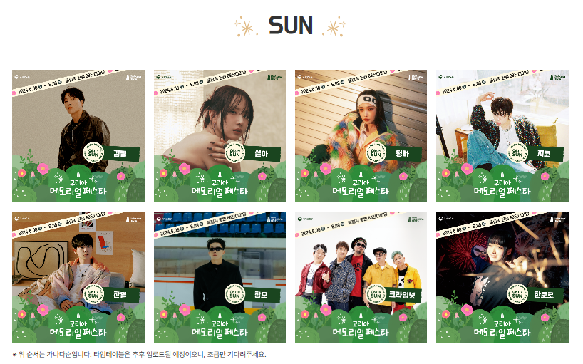행사는 2024년 6월 8일(토) ~ 9일(일) 이틀간 진행되면 14:00 ~ 21:30 (450분)간 진행이 됩니다. K-pop스타 8일(김뜻돌,NELL,딕펑스,스텔라장,자이언티,폴킴) 9일(김필,설아,청하,지코,찬열,창모,크라잉넛,한로로)이 출연하며 오는 23일부터는 나머지 10명이 순차적으로 공개될 예정이라고 합니다. 본 공연은 전석 자유석이며 전 연령이 관람 가능합니다. 하지만 14세 미만은 보호자 동반이 필수이며 가족관계증명서를 준비해주셔야 합니다.