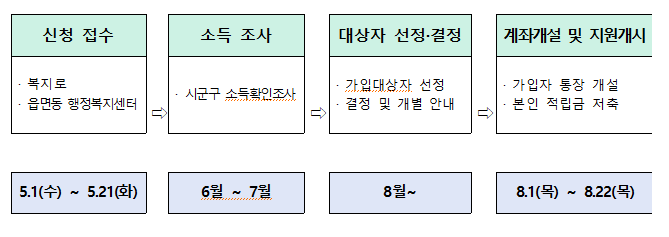 가입을 희망하는 청년은 신청 기간 내 주소지 시군구 내 가까운 어느 읍면동사무소(행정복지센터)에서도 방문하여 신청 가능하며, 보건복지부가 운영하는 복지포털사이트 복지로에서도 신청 5월 1일(수)부터 5월 21일(화)까지 할 수 있습니다.
