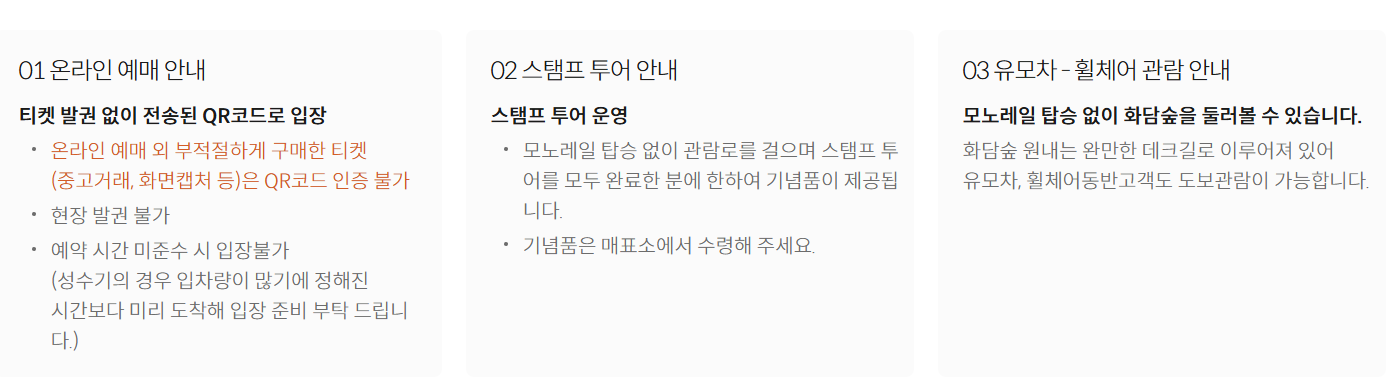 계획했던 날짜에 화담숲이 운영하지 않는다면?! 상상만 해도 너무 아쉽겠죠?ㅠㅠ 화담숲 공식 웹사이트에서 운영 시간과 휴원일을 꼼꼼히 체크하는 것은 필수 중의 필수 입니다. 특히 성수기와 비수기의 운영 시간이 다를 수 있으니 주의 하세요!