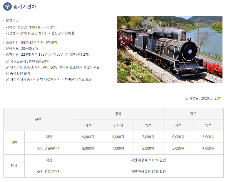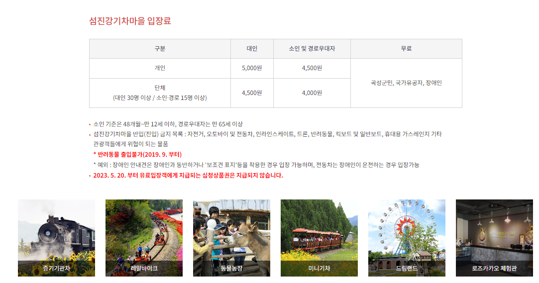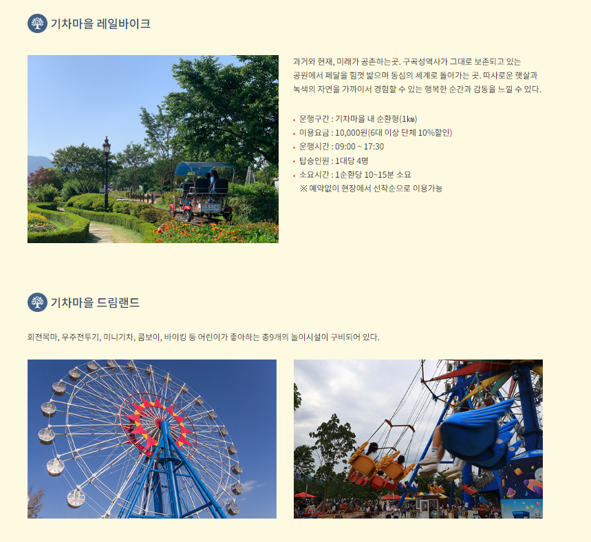 곡성 섬진강 기차마을은 섬진강변을 달리는 증기기관차와 레일바이크, 요술랜드, 동물농장 등 익숙함과 새로움이 공존하는 새로운 개념의 테마파크입니다. 1960년대를 고스란히 옮겨 놓은 것 같은 플랫폼으로 연기를 뿜으며 기차가 들어오면 내리는 승객들과 그것을 배경으로 사진을 찍는 소란스러움이 옛 기차역의 향수를 불러 일으킵니다.