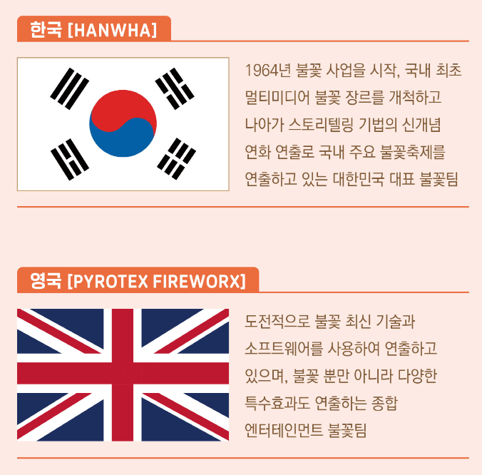 국제행사로 확대되고 해외 유명한 불꽃팀들이 매년 참가하면서 콘텐츠도 단순 불꽃 중심에서 탈피하여 제작 공연과 불빛 퍼레이드 등 산업과 문화적 요소를 융합해 다채롭게 펼쳐지는 축제입니다.