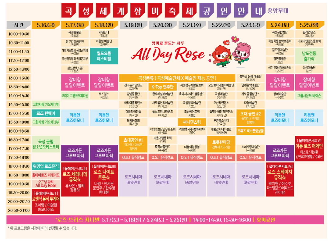 🎉 2025년 곡성세계장미축제가 드디어 베일을 벗었습니다!올해는 ‘All Day Rose’를 테마로, 전 세대를 아우르는 초호화 가수 라인업과 함께 다시 돌아온다는 소식입니다.