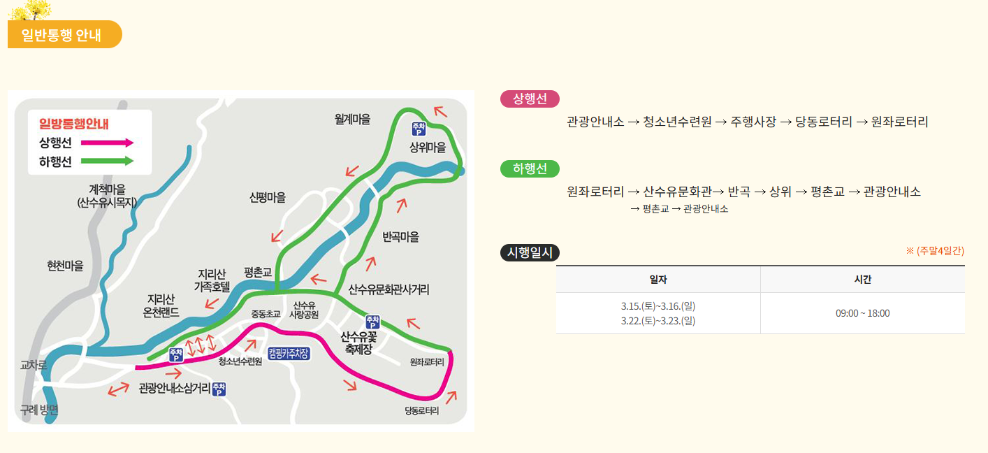 - 🎉 주요 행사 : 전통공연, 산수유차 체험, 야간 조명 행사, 사진 콘테스트 등