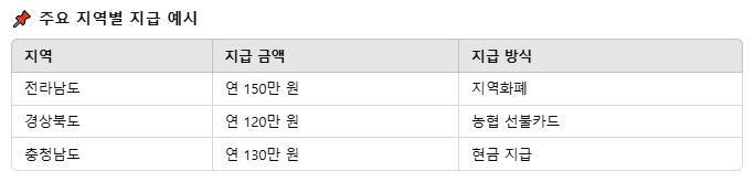 - 지급 방식 : 지역화폐, 농협 선불카드, 현금 중 택일 가능 (지자체별 상이)