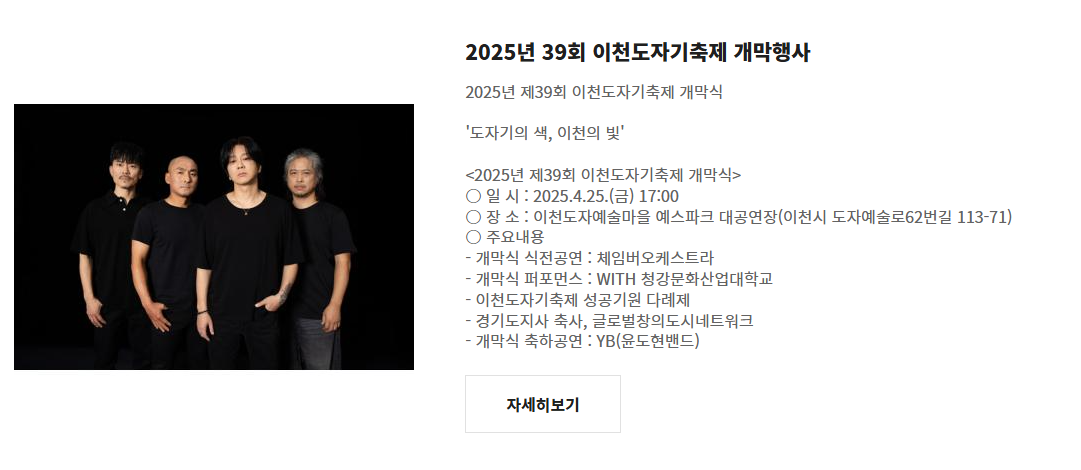2025년 봄, 단 하나의 축제를 꼽아야 한다면 단연 이천도자기축제입니다. 특별한 개막식 라인업과 놓치면 후회할 프로그램들이 가득!🎶