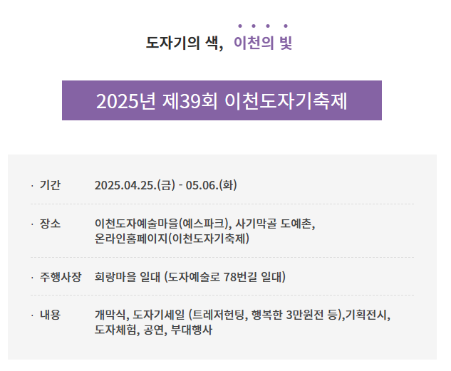 - 📞 문의처: 이천도자예술마을 관광안내소 031-638-1995