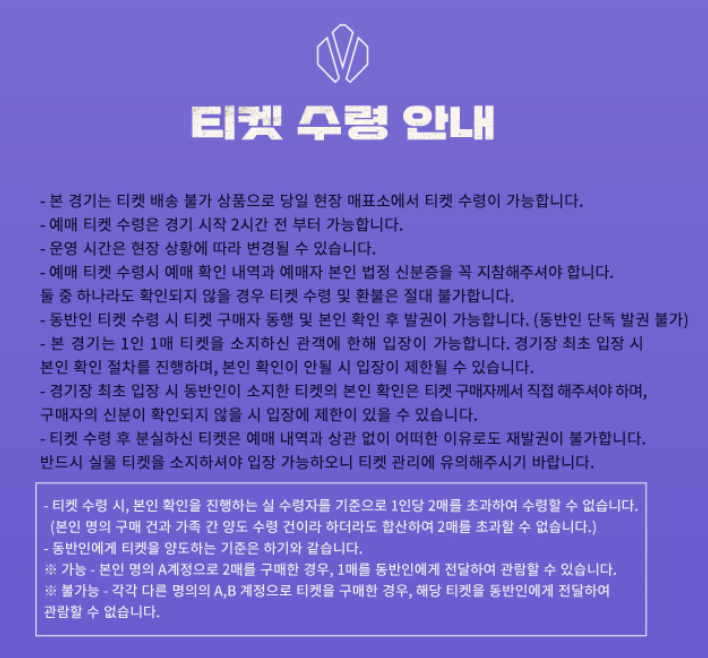 ⚠️ 1인 2매 원칙 인터파크와 팀별 판매에서 각각 구매하더라도 1인당 총 2매만 예매할 수 있습니다. 동일 명의로 3매 이상 구매 시, 초과 티켓은 무효 처리되며 환불이 불가하니 주의해 주세요.