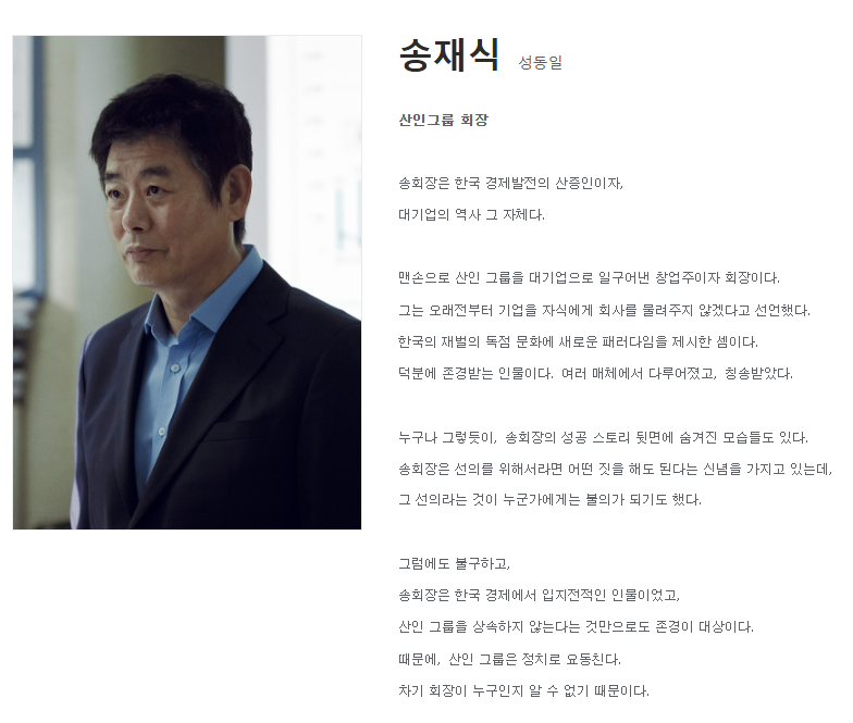 산인건설을 거대 그룹으로 키운 인물로, 기업을 살리기 위해 윤주노를 협상가로 영입합니다. 강한 카리스마와 철저한 현실주의자로 기업 생존을 최우선시합니다.