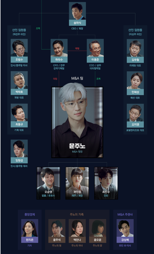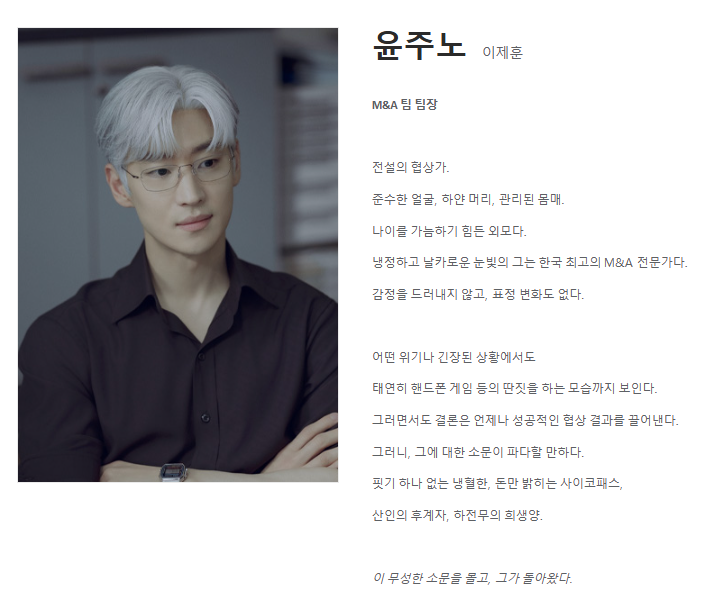 송재식 회장의 최측근이자 산인그룹의 외부 협력을 총괄하는 인물입니다. 윤주노의 M&A 팀을 도와 협상의 판을 만들어갑니다.