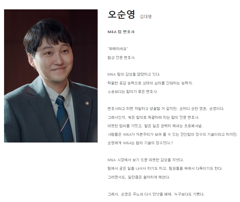 🔹 오순영 (김대명) - 윤주노의 파트너, 협상 변호사