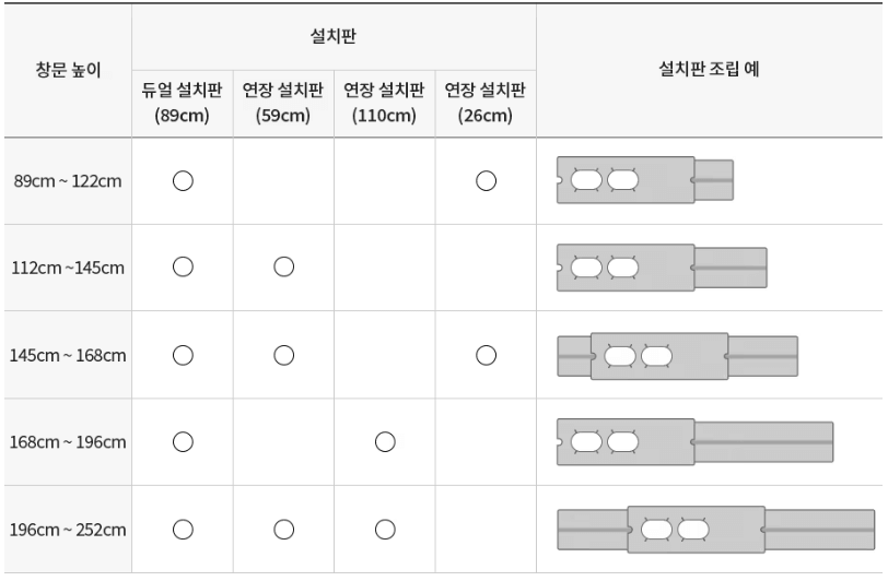 * 최소 89cm부터 최대 252cm까지 다양한 창문 높이에 맞춰 설치할 수 있는 설치키트를 제공합니다.